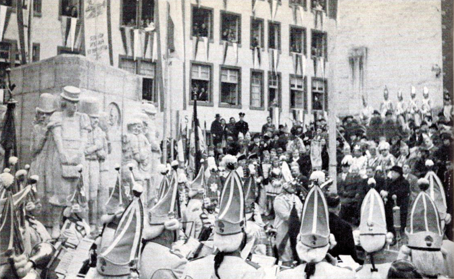 Im Jahr 1914 zog der Rosenmontagszug unter dem Motto "Weltausstellung in Köln" durch die Straßen der Domstadt. Es war der bis dahin größte und prachtvollste Zug aller Zeiten. Das Motto des Zuges nahm Bezug auf die im Sommer stattfindende Werkbundausstellung. Nach dem Vorbild der großen Weltausstellungen war auf dem rechten Rheinufer, auf dem Gelände des heutigen Rheinparks, ein riesiges Areal mit Ausstellungspavillons, Schaugebäuden, Restaurationsbetrieben, einem beachtlichen Theaterbau und einem großem Vergnügungspark entstanden. Man erreichte das Ausstellungsgelände mit einer Fähre. Direkt vom Anleger gelangten die Besucher auf den zentralen Platz des Ausstellungsgeländes in dessen Mitte ein großer Musikpavillon stand. Die Ausstellung wurde im Mai 1914 mit einem Konzert der Deutzer Kürassierkapelle eröffnet. Danach fanden in dem Musikpavillon täglich Blasmusikkonzerte statt, mit denen die Besucher auf dem Ausstellungsgelände willkommen geheißen und den gesamten Tag über unterhalten wurden. Die Ausstellung sollte eigentlich bis Oktober geöffnet bleiben, wurde aber am 6. August 1914 aufgrund des Ausbruchs des Ersten Weltkrieges abgebrochen.